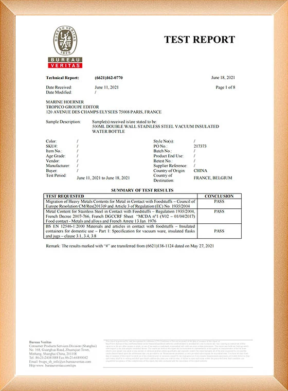 Mayroon kaming independiyenteng pangkat ng pananaliksik at pagpapaunlad, na may independiyenteng patentadong stainless steel na thermos cup. Ang pabrika ay pumasa sa BSCI inspeksyon at sertipikasyon.