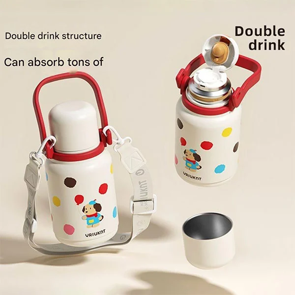 Ang Dishwasher Safe Vacuum Flask ay may malaking hawakan at may shoulder strap, na angkop para sa mga bata o matatanda upang iangat at palayain ang kanilang mga kamay. Ang takip ay maaari ding magsilbi bilang isang tasa ng tubig